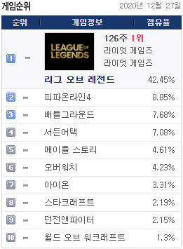 1위 리그오브레전드 League of Legends(LOL) 42.78% -> 42.45%(▼0.33%)